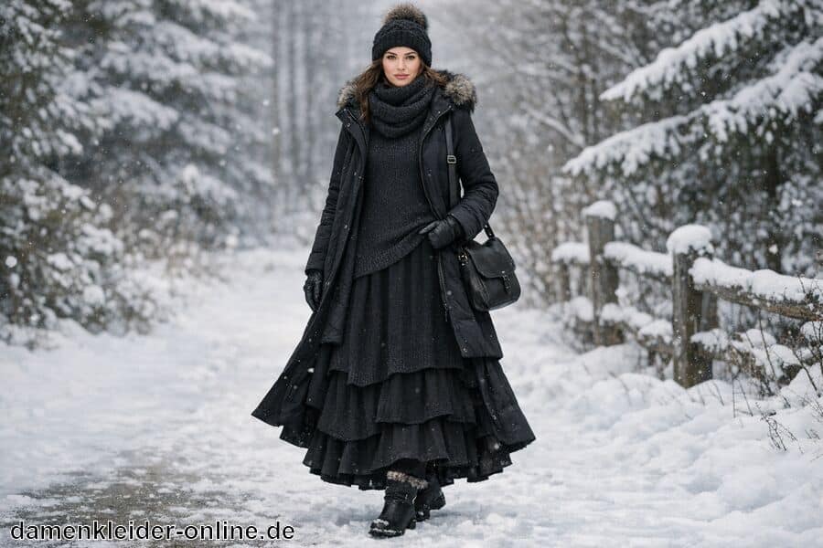 Die Kombination verschiedener Texturen und Farben ermöglicht einen harmonischen Stil, der Schutz und Eleganz vereint. Durch gezielte Auswahl an winterfesten Accessoires lässt sich das lange Kleid vielseitig einsetzen und passt sich unterschiedlichen Anlässen sowie Wetterverhältnissen an.