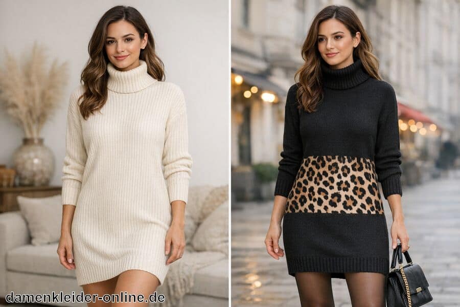 Das Pulloverkleid mit Rollkragen zeichnet sich durch eine vielfältige Auswahl an Stoffen und Designs aus, die unterschiedliche Stilrichtungen ermöglichen. Weicher Strickstoff sorgt für ein angenehm warmes Tragegefühl und verleiht dem Kleid eine klassische Optik, während Baumwollmischungen einen lässigen Look schaffen. Künstlerisch gestaltete Muster oder unifarbene Varianten bieten die Flexibilität, das Outfit ganz individuell zu gestalten.